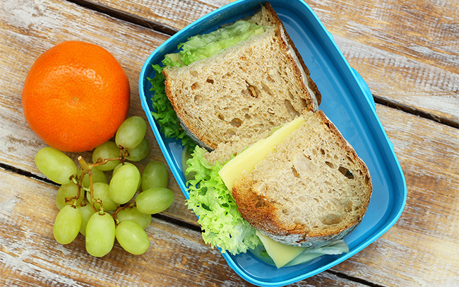 Close up of packed lunch sandwich with fruit ❏ coins for car park/car park payment details ❏ drinks and snacks ❏ phone and charger ❏ camera ❏ books magazine ❏ comfy clothes/shoes/shorts ❏ overnight stay clothes/toiletries etc. if planning/able to stay
