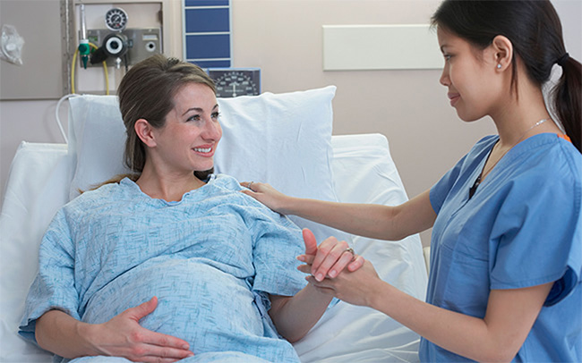 Smiling pregnant woman in hospital bed has her hand held by a midwife प्रसव और जन्म में सहायता का सुझाव दिया जा सकता है; या तो